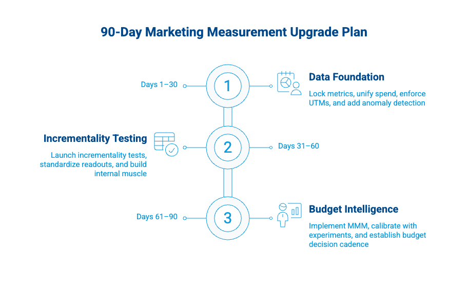 This plan works whether you’re in a startup, a mid-market company, or partnering with a digital marketing agency. The goal is to move from dashboard-watching to real marketing performance measurement in three focused sprints.