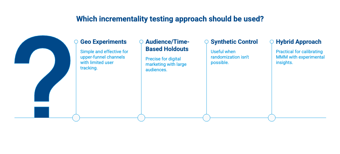 The most practical approach for most organizations: run small-scale experiments to generate insights and ground truth, then use those results to calibrate your MMM (covered in the next section). This gives you causal proof without needing to run experiments on every channel simultaneously.