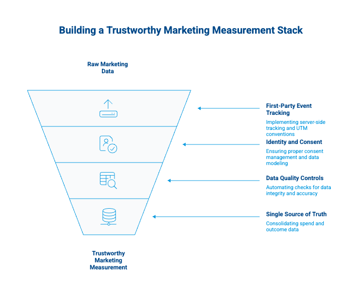 No model or experiment will save you if the underlying data is garbage. Before investing in marketing mix modeling or incrementality tests, your team needs to get four foundations right. Think of this as the infrastructure layer that makes every other marketing measurement approach trustworthy. If you skip this step, your entire measurement setup becomes fragile.