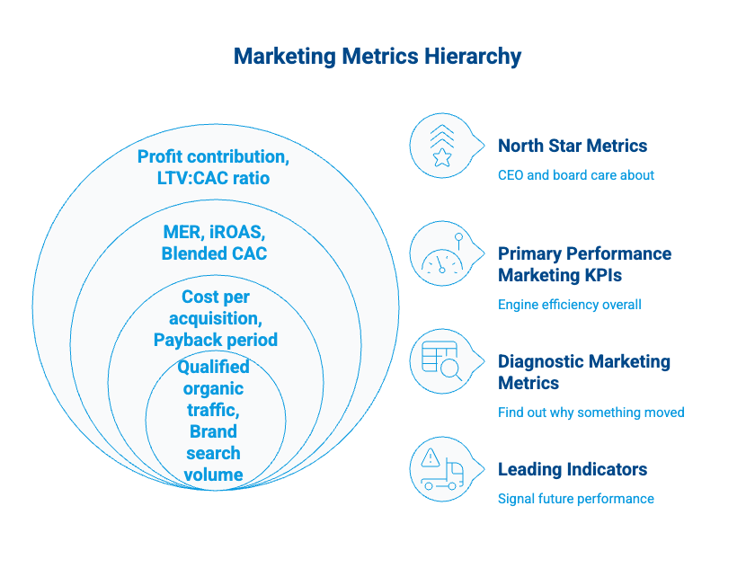 At the top of the hierarchy are the numbers your CEO and board care about. They answer one question: “Is our marketing investment making the business more valuable?”