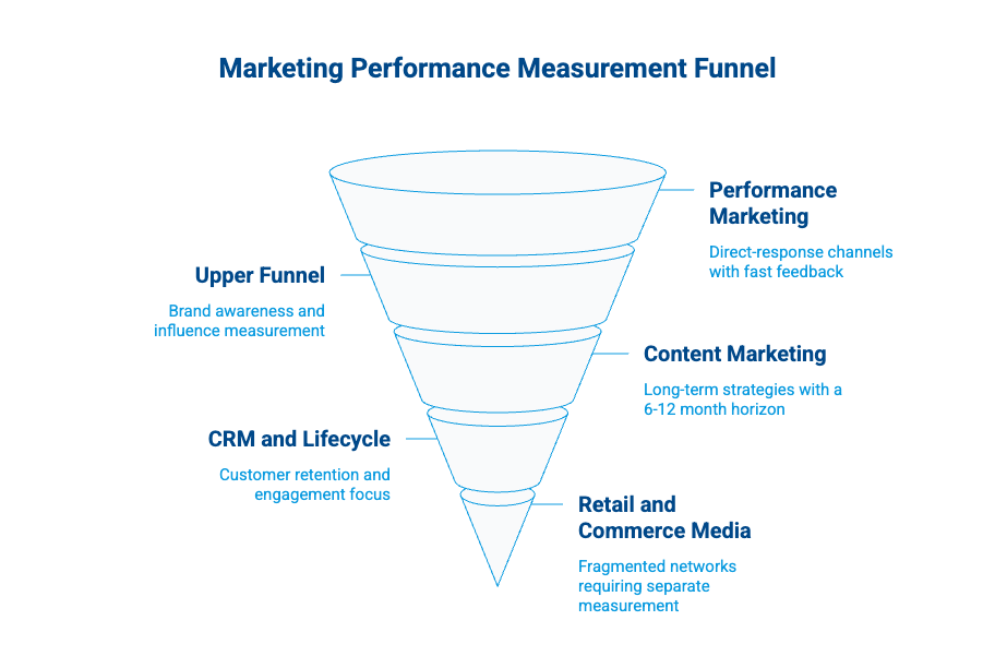 Here’s a practical channel-by-channel reference for tracking marketing performance across your entire portfolio of marketing activities. Use it to track performance marketing results and decide which measurement approach fits each channel.